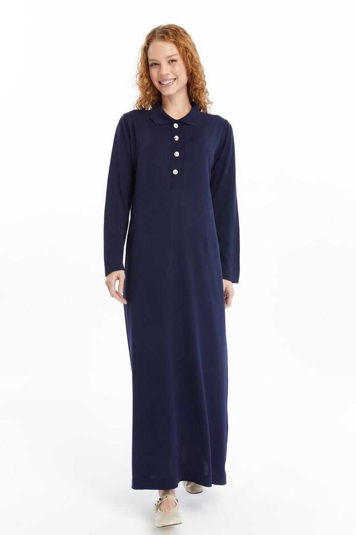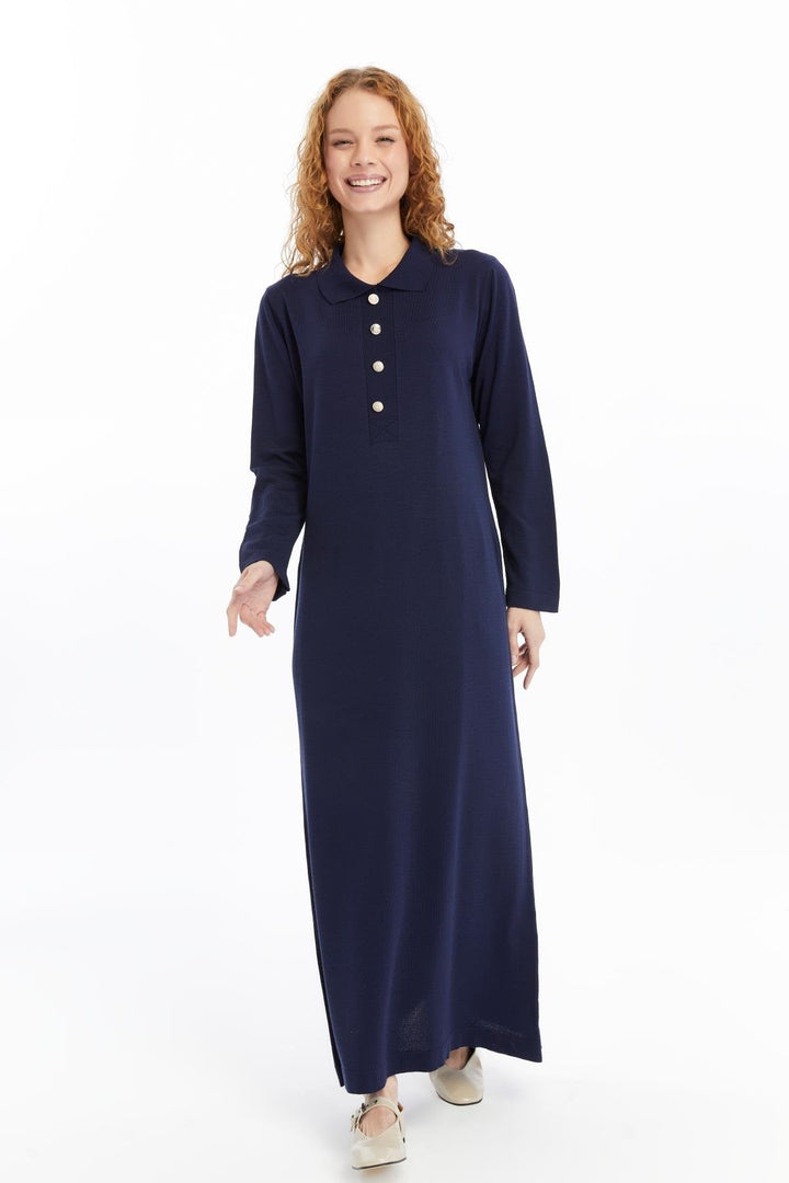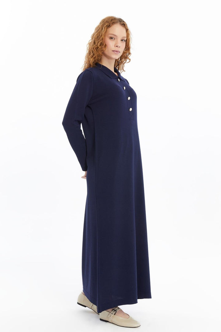 25006 Women's Shirt Collar Detailed Half Placket Thin Seasonal Cold Yarn Knitwear Dress Navy Blue