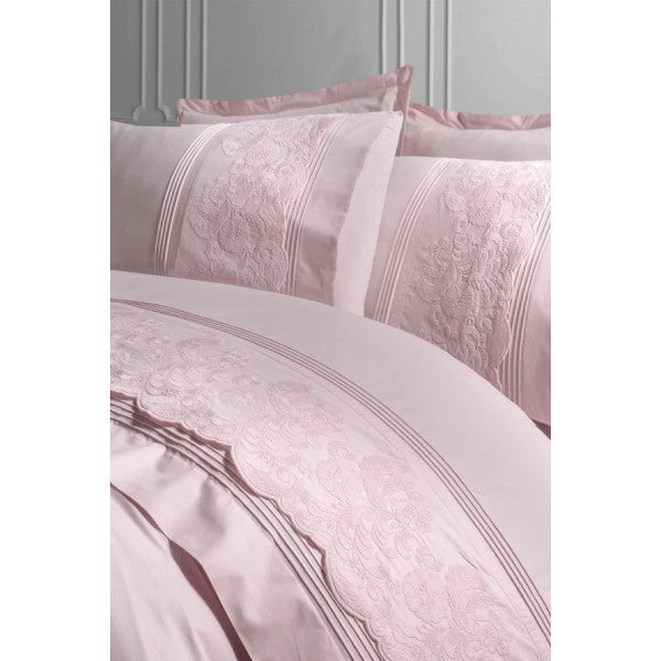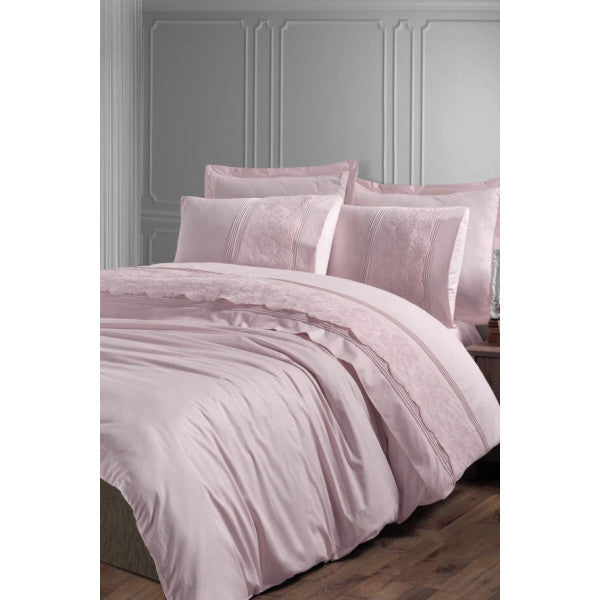 The Elegance Grande – Powder Pink Double Duvet Cover Set adds a romantic touch to any bedroom with its elegant details and soft color tone. Crafted from a glossy cotton sateen fabric, this set creates a comfortable and aesthetically pleasing sleeping space thanks to its silky texture and natural sheen. The calming shades of powder pink create a warm, peaceful, and inviting atmosphere in the bedroom.