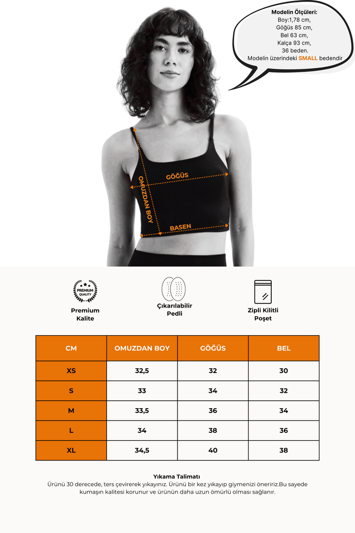 Thin Straps Light Support Removable Padded Bra Black Women's Sports Bra - Spica Slimming and Firming Features: Provides perfect support to the breasts and gives a firm look. Breathable Fabric Technology: The breathable structure that prevents sweat and ensures air circulation, provides freshness all day long. Flexible and Shape-Preserving Design: Flexible fabric structure that maintains its form while offering freedom of movement. Stylish and Minimalist Look: Can be used easily at the gym, in activities such as yoga, pilates, running, walking, traveling and daily city life. Washing Instructions: Wash the product inside out at 30 degrees. This way, the quality of the fabric is preserved and the product life is extended. Material: 92% Polyester, 8% Elastane Weave Type: Knitted Measurements of the Model in the Image: Height: 1.78 cm, Chest 85 cm, Waist 63 cm, Hip 93 cm, size 36. The Sports Bra on the Model is Size S. Due to studio lights, the color of the product may differ slightly from the photos.
