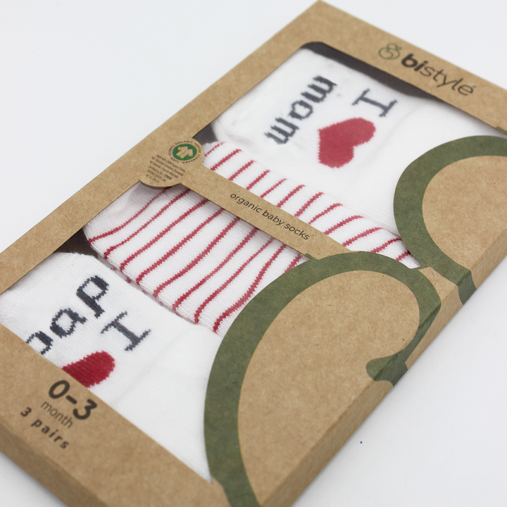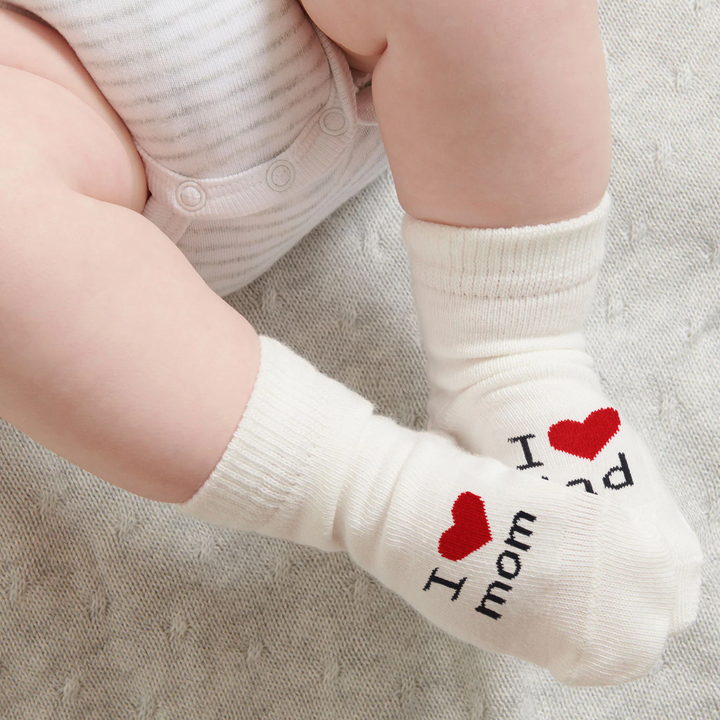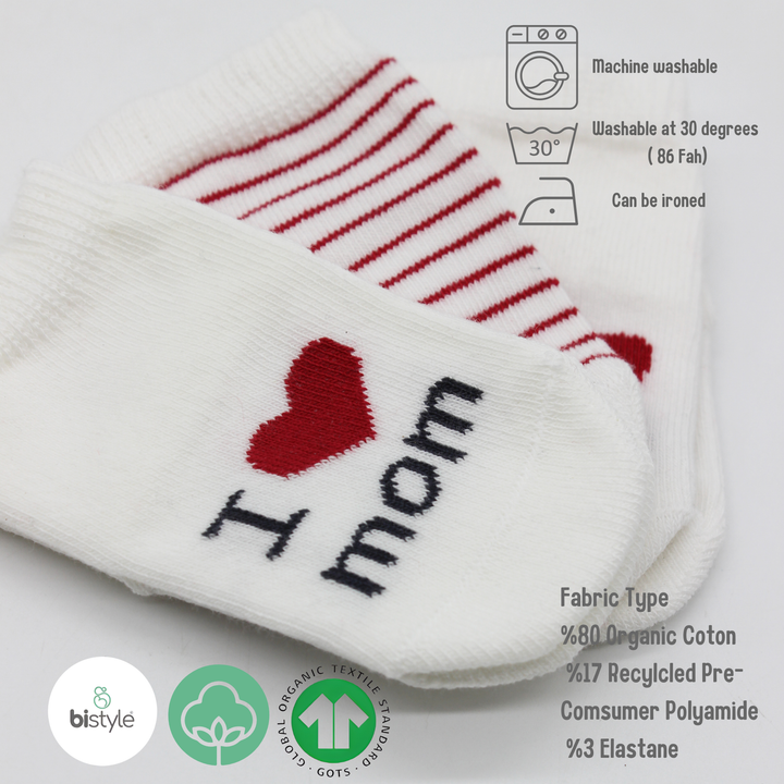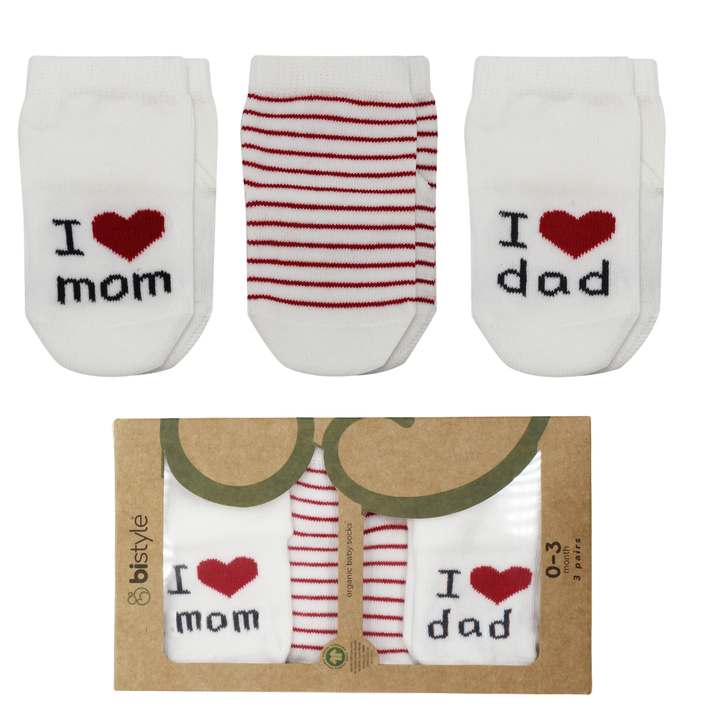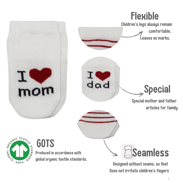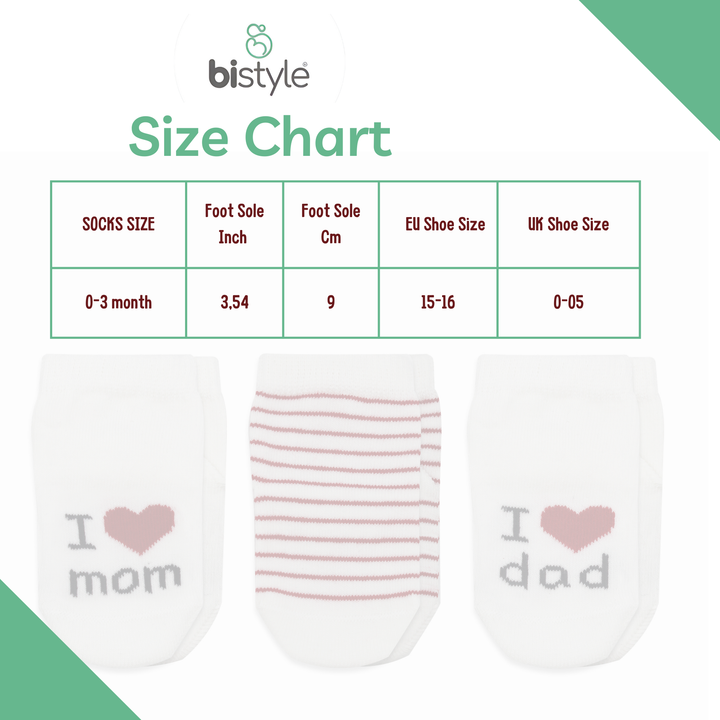PREMIUM QUALITY – Bistyle baby socks are made from 100% organic cotton, offering softness, breathability, and comfort for your newborn’s delicate skin. The fabric is gentle, non-irritating, and machine washable without losing color or shape. MADE IN TÜRKİYE. ADORABLE DESIGN – Featuring the lovely “I Love You Dad & Mom” print, these socks are a sweet way to celebrate family love. The cute message adds charm to any baby outfit and makes every tiny foot even more adorable. COMFORT & FIT – Designed for newborns aged 0–3 months. The stretchy cuff ensures a snug but gentle fit that won’t leave marks. Anti-slip soles help keep your baby safe and steady during their first little movements. PERFECT GIFT – A meaningful and practical gift for new parents. Ideal for baby showers, newborn celebrations, or hospital discharge gifts. Comes in a soft, cozy texture that keeps your baby’s feet warm and happy. CARE INSTRUCTIONS – Wash inside out at 30°C with mild detergent. Do not bleach or tumble dry. Keeps its softness and shape even after multiple washes.