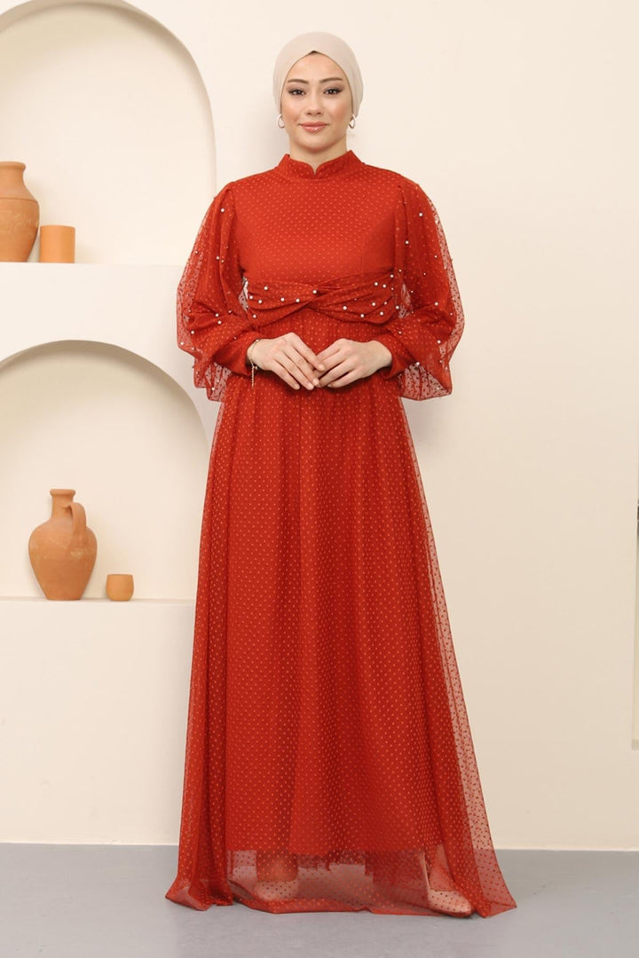 Fabric Feature: Made of tulle fabric. Product Feature: New season hijab fashion product. It is lined. It has a usable zipper on the back. Sleeve flounces and waist collar are pearl detailed. Product color may differ due to concept shots. The model is wearing a size 38. Size 38 Evening Dress Measurements: Product Height: 145 cm - Bust: 80 cm - Waist: 78 cm - Hips: 90 cm Body measurements increase by 3 or 4 cm. (Product Length Does Not Change)