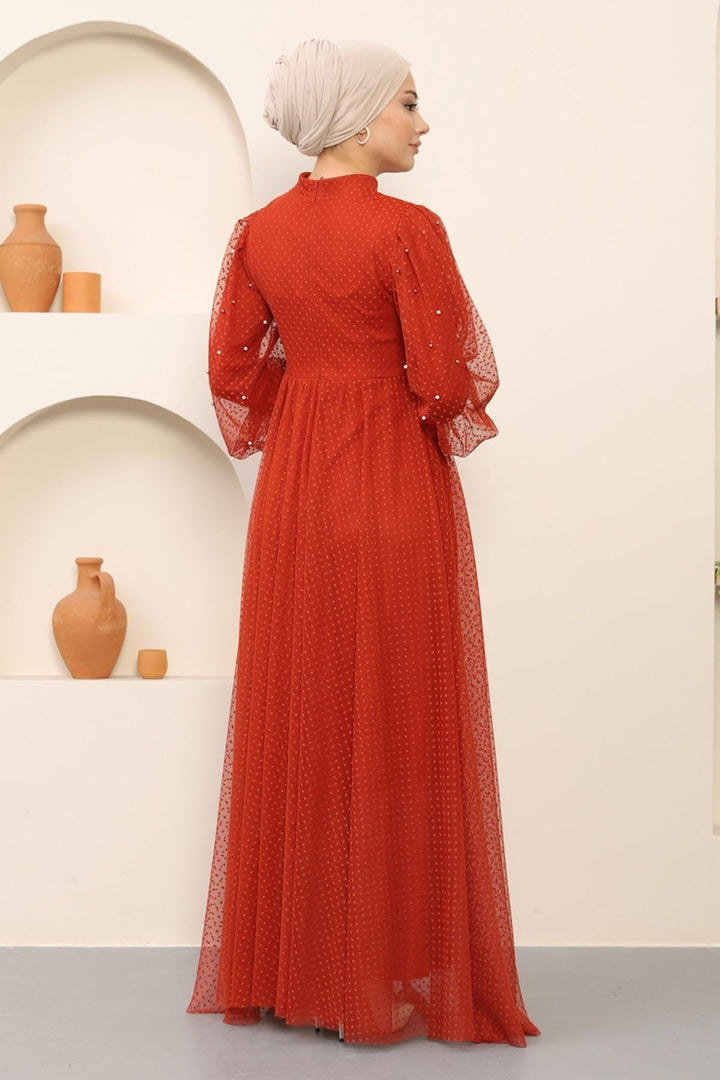 Pearl Detailed Tulle Evening Dress Tile Msw12238-4