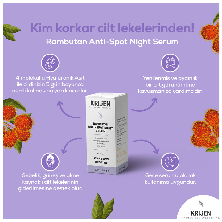 Concentrated formula against dark spots and uneven skin tone. Key Ingredient Rambutan: Pure Rambutan Extract, with its feature of being a plant-based retinol; supports natural collagen synthesis and the skin's elastic fiber network. It acts as a Retinol by working gently under and on the skin's surface without creating sensitivity. It provides effective care for many skin problems such as blemishes, pores and skin damage caused by aging. Known for its many health benefits in Southeast Asia, Rambutan is a rich source of antioxidants, vitamins and trace elements. Mandelic Acid: Mandelic acid is an alpha hydroxy acid (AHA) obtained from bitter almonds. By creating a micro-peeling effect on the skin, it helps renew skin texture and even out skin tone. It helps provide a smoother appearance by gently removing dead skin. Licorice Root Extract: Thanks to the galibrin component contained in licorice root; By supporting the inhibition of melanin production, it helps provide care against skin blemishes caused by the sun, acne, aging, pregnancy and various reasons. It is also a powerful antioxidant and supports soothing the skin. Alpha Arbutin: It is generally obtained from glucose molecules found in blueberries. While it helps eliminate skin blemishes caused by various reasons, it also supports the prevention of new blemishes. It provides a smooth and even skin appearance. It gives the skin a vitality and radiant appearance. General Effects It is suitable for night use for all skin types. Thanks to the herbal Retinol it contains, Rambutan, 5% Mandelic Acid, Licorice Root Extract and Alpha-Arbutin, it supports skin regeneration while providing effective care against skin blemishes caused by various reasons. With the support of Hyaluronic Acid and Niacinamide, its skin brightening and moisturizing effect is intensified.