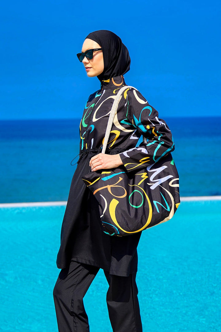 Rivamera Modest Full-Coverage Swimsuit - R2505 Infused with dynamic patterns and sleek lines, the Rivamera R2505 modest swimsuit elevates your beachwear style. Designed with a high neckline, adjustable front ruching, and a functional side slit, this 4-piece set includes a matching tote bag to complete the look with elegance and ease. 🧵 Key Design Features HIGH NECKLINE The high neckline provides full sun protection while offering a modern, sporty appearance. FRONT ADJUSTABLE DRAWSTRING The adjustable drawstring allows a customizable fit at the waist, combining functionality and elegance. SIDE SLIT The slit on the tunic side allows greater freedom of movement during swimming. FREE MATCHING BEACH BAG Comes with a complimentary beach bag in matching fabric – a perfect pairing for your holiday ensemble. 🎥 Product Video 📌 Technical Specifications Rivamera is produced with MARINA's trusted quality. Water-repellent fabric prevents water absorption. Quick-dry technology ensures all-day comfort. Vibrant patterned top adds dynamic beach flair. Front zipper design makes dressing easier. Adjustable waistband for a tailored fit. Straight-leg pants offer comfort and mobility. Tunic, pants, and tote bag are 100% woven polyester. Swim cap: 90% polyester, 10% elastane knit fabric. Set includes 4 pieces: tunic, pants, swim cap, and tote bag. Tunic length is approximately 94 cm (37 inches). Model wears size S. Model measurements: Height 178 cm / Bust 83 cm / Waist 60 cm / Hips 90 cm. Each size increases by approx. +2.5 cm in width and +1 cm in length.