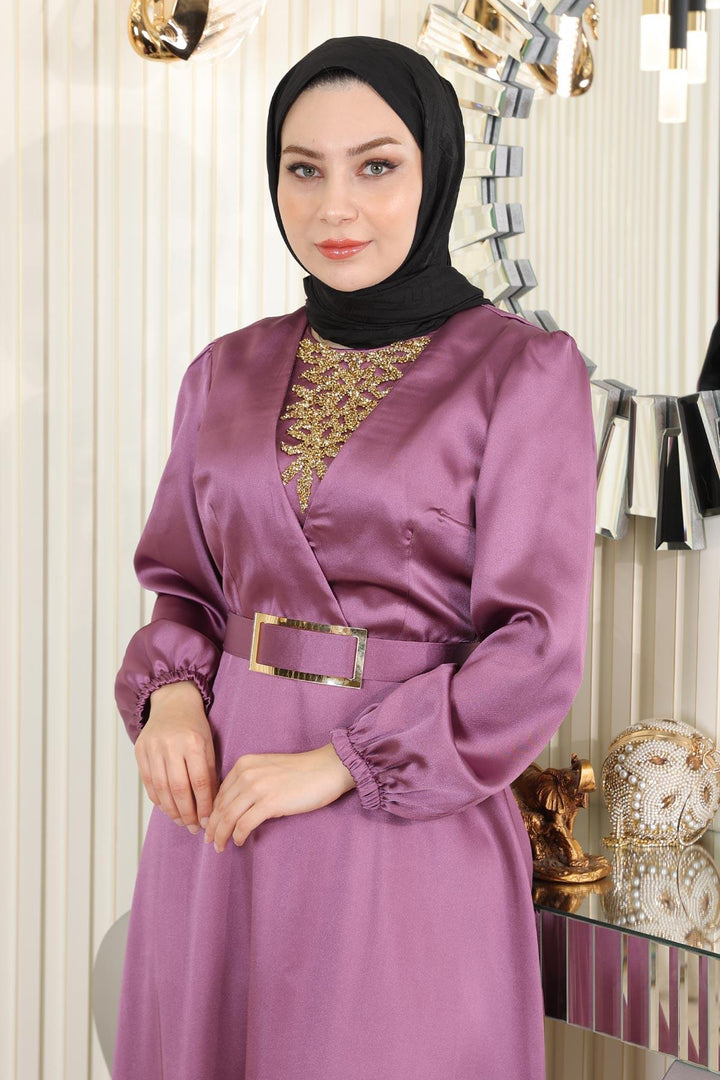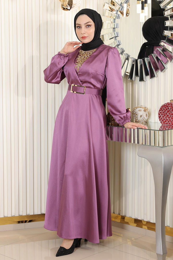 Satin Evening Dress With Stone Details, Dusty Rose Msw19901-5