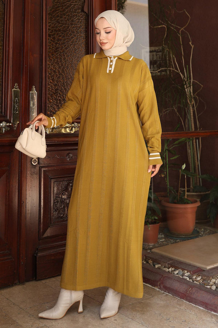 Fabric Feature: Made of knitwear. Product Feature: New season hijab fashion product. Unlined. It has three usable buttons in the front. Flexible fabric. Product color may vary due to concept shots. It is the Standard Size on the Model. Standard Size Knitwear Dress Measurements: Product Length: 136 cm - Chest: 120 cm - Waist: 112 cm - Hips: 116 cm