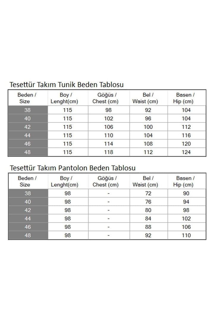 Fabric Feature: Made of combed linen fabric. Product Feature: New season hijab fashion product. Unlined. The tunic has a zipper and buttons that can be used from the back. The buttons on the front are accessories. The cuffs are elastic. The trousers have an elastic waist. The product color may differ due to concept shots. The model is wearing a size 38. The size chart is in the pictures.