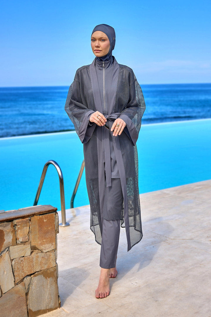 Charcoal Full Length Modest Mesh Kimono – Marina P2501-5 The Marina P2501-5 kimono in deep charcoal tones offers the perfect balance of elegance and privacy. Made from breathable mesh, it’s designed for modest women seeking both function and style at the beach or pool. ✨ Editor’s Note With its sleek charcoal color and flowing silhouette, the P2501-5 kimono adds a refined touch to your swimwear ensemble. It’s ideal for those who appreciate darker, versatile tones. The lightweight mesh ensures comfort in warm climates, while the belt allows for a custom fit. A reliable, modest cover-up for your next vacation or pool day. 🎥 Product Video 📌 Product Features Kimono Length: 130 cm / 51.2 inches Size: Standard fit – adapts to multiple body types Design: One-piece mesh kimono with waist tie Fabric: 90% Polyester – lightweight mesh texture Breathable, quick-dry material perfect for summer Loose-fitting silhouette for modest full coverage Elegant charcoal color for versatile styling Package Includes: 1 kimono (belt included) Model Measurements: Height 178 cm (5’10”), Bust 83 cm, Waist 60 cm, Hips 90 cm Model is wearing: Standard size 🧼 Care Instructions Hand wash in cold water Do not bleach or tumble dry Hang to dry in a shaded area Do not iron the mesh fabric ✅ Why Choose This Kimono? Designed for hijabi women and modest travelers Pairs perfectly with burkinis or Islamic swimsuits Breathable and flattering – ideal for hot weather Compact and lightweight – great for travel Fast delivery and easy returns worldwide