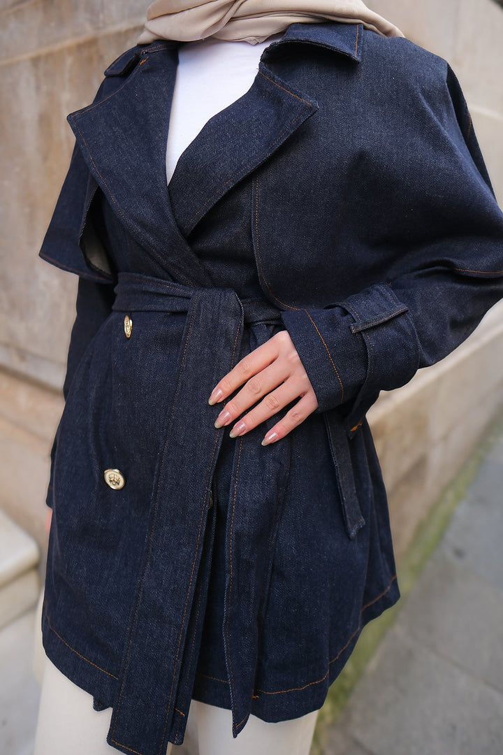Dark Blue Short Denim Trench Coat With Cape Sleeves