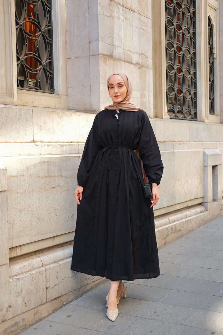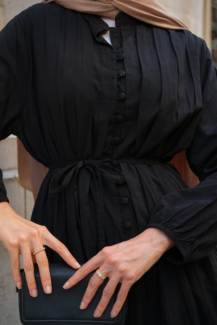 Dress With Pleated Details And Waist Tie – Black
