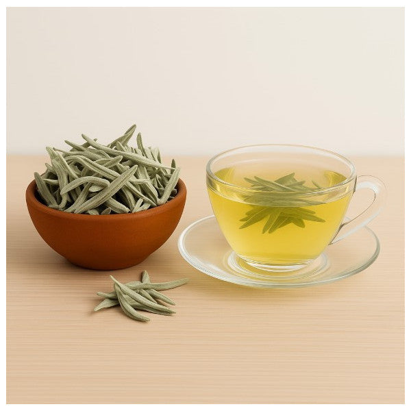 Dried sage is especially popular in beverage form when steeped in hot water. A few leaves are sufficient for steeping; using more produces a more intense and pungent flavor. Its slightly herbaceous and refreshing scent makes it a popular culinary spice. It can be added in small amounts to meat dishes, soups, sauces, and marinades to add depth.