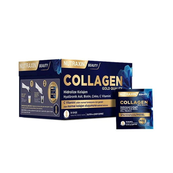 nutraxin beauty gold collagen, gold collagen 10000mg sachets, nutraxin collagen 30 sachets , premium hydrolyzed collagen shots, hyaluronic acid gold collagen, beauty collagen sachets
