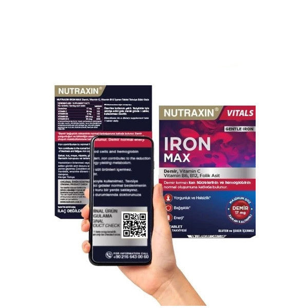 Nutraxin Iron Max is a food supplement containing 17 mg of timed-release iron in bisglycinate form. The formulation also contains vitamins C, B12, B6 and folic acid.