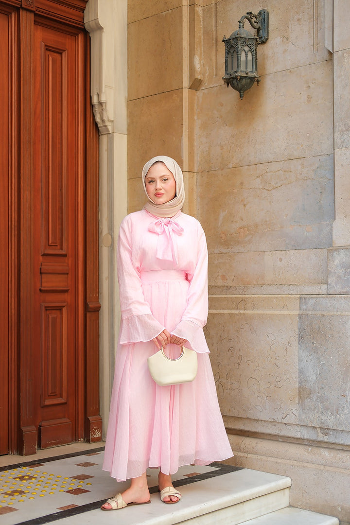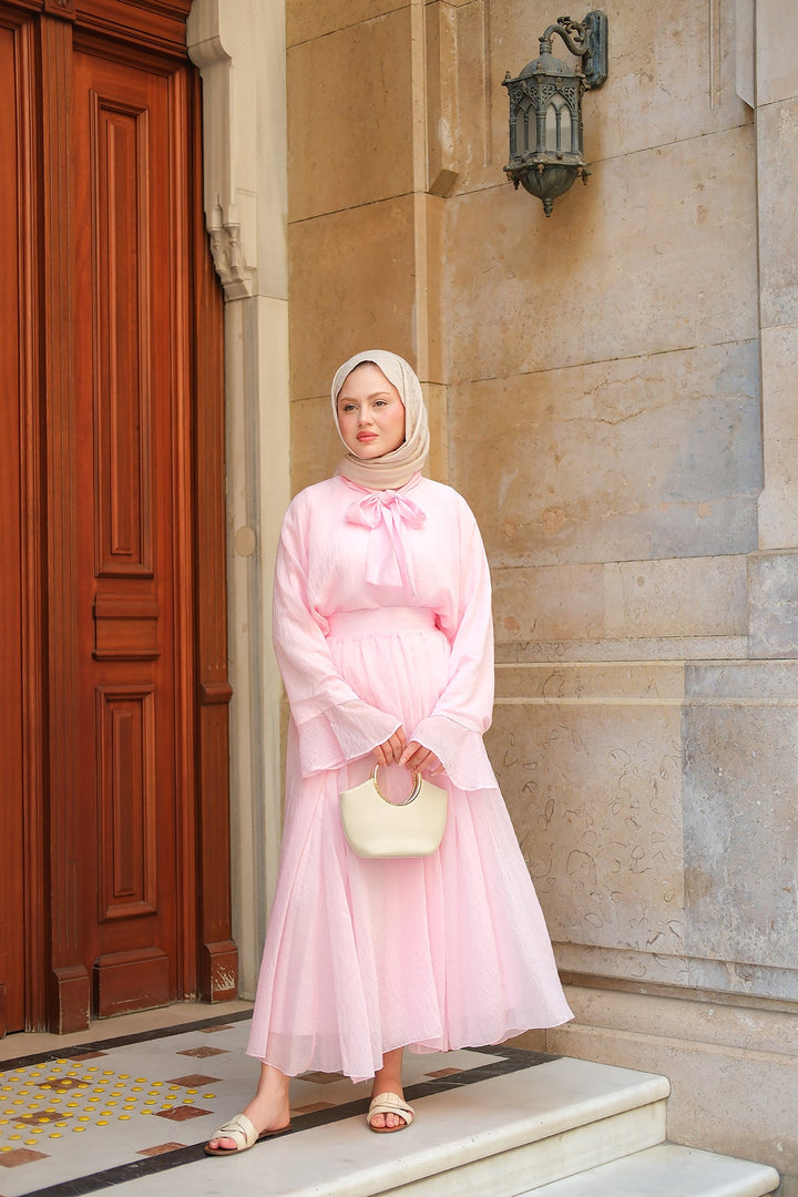 Pink Two-Piece Set With Tulle Accents And Tie Details