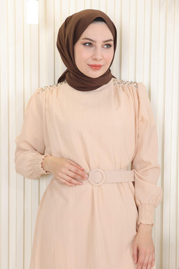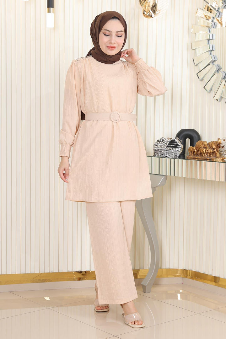 Fabric Feature: Made of combed linen fabric. Product Feature: New season hijab fashion product. Unlined. Tunic has a usable half zipper on the back. Shoulders have stone detail. Belt is removable. Trousers have an elastic waist. Product color may vary due to concept shots. The model is wearing a size 38. Size Chart is in the pictures.