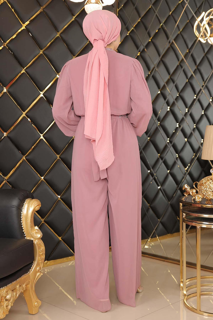 Stone Detailed Chiffon Jumpsuit Evening Dress Dusty Rose Msw19153-3