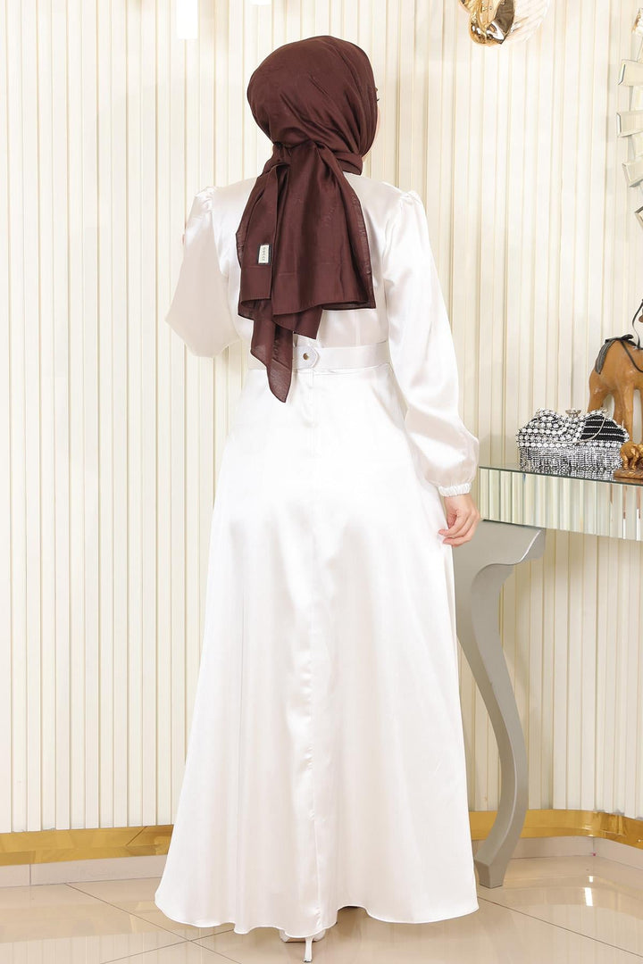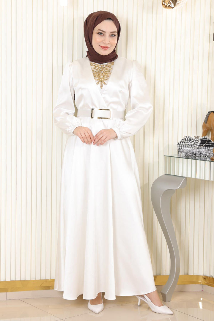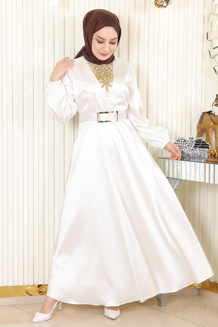 Stone Detailed Satin Evening Dress White Msw19901-2